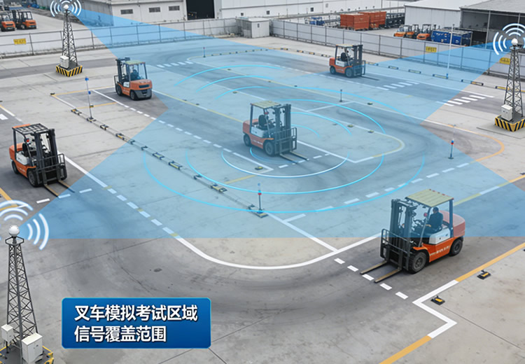 2. 设备适配与覆盖:场地内全面覆盖基站信号,确保每台叉车的车载设备均可稳定接收定位与通信信号,保障评判的精准性;配备计时警灯,分布于场地关键位置,训练或考试结束后警灯爆闪,协助场地工作人员快速识别车辆状态,便于现场管理。